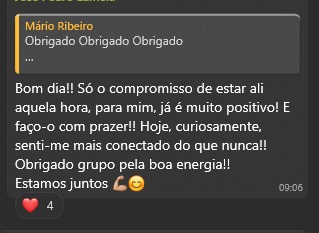 Temos um grupo WhatsApp exclusivo onde partilhamos experiências, dúvidas e apoiamo-nos mutuamente. É um espaço seguro e acolhedor. Aqui, ninguém caminha sozinho.
